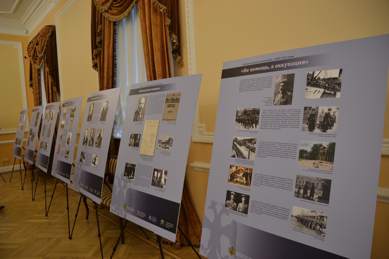 В колонном зале Новгородской областной филармонии открылась выставка "Защита суверенитета Российского государства. История и современность"