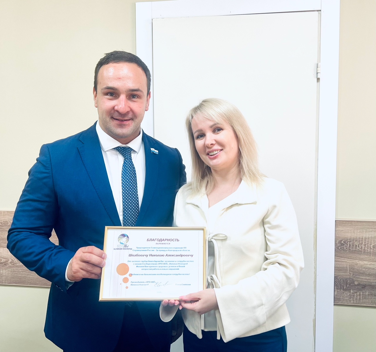 Руководитель некоммерческой организации ""ПРО НЕЁ"_ Великий Новгород", объединяющей семьи, воспитывающие детей с ограниченными возможностями здоровья, Елена Семенова вручила БЛАГОДАРНОСТЬ председателю Совета регионального отделения партии СПРАВЕДЛИВАЯ РОССИЯ в Новгородской области Николаю ШВАБОВИЧУ.