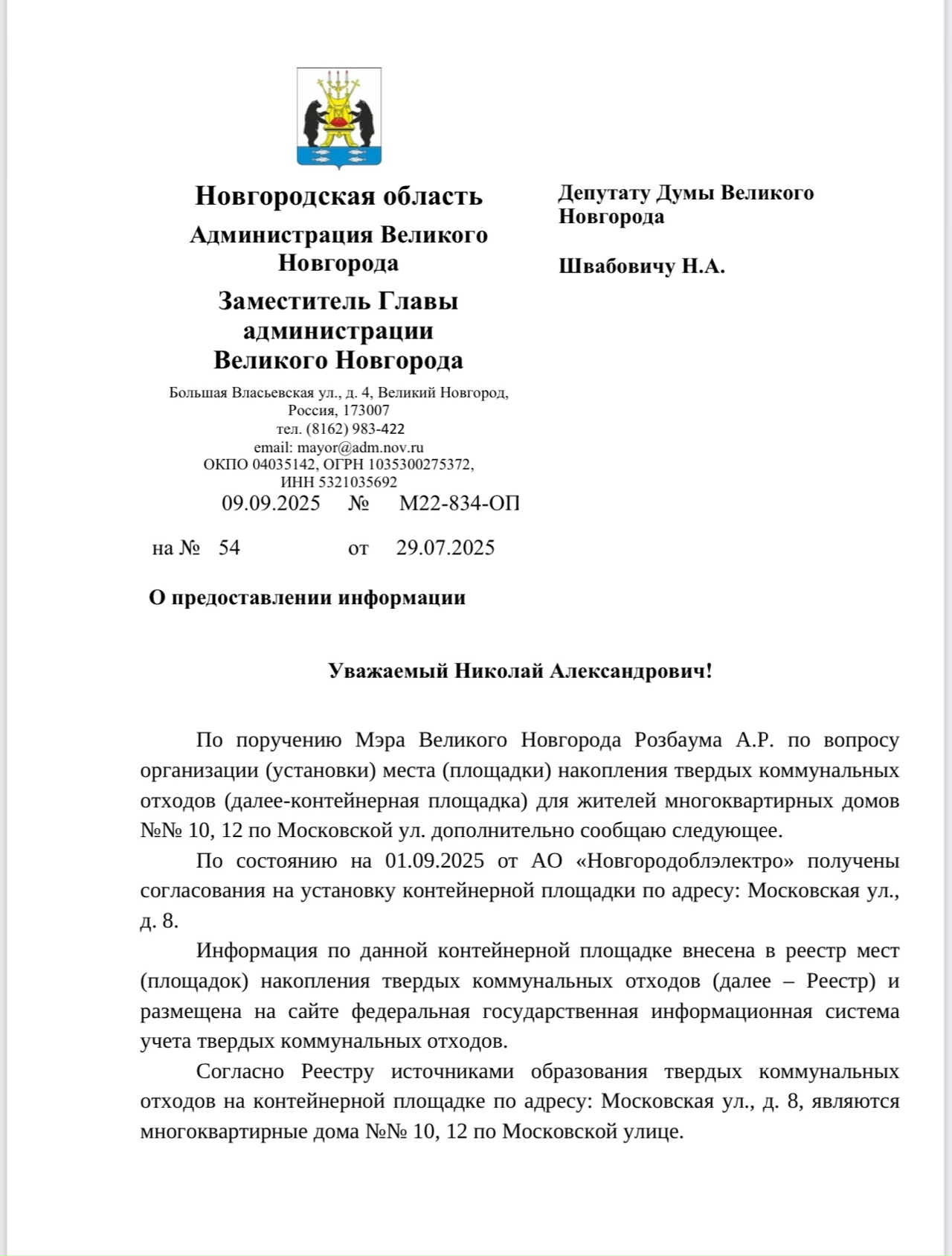 - Мною было направлено соответствующее обращение в адрес мэра Великого Новгорода А.Р. Розбаума, на которое в начале сентября получил ответ, – рассказал Николай ШВАБОВИЧ. – Выдержка из официального ответа:"По состоянию на 01.09.2025 от АО "Новгородоблэлектро" получены согласования на установку контейнерной площадки по адресу: Московская ул., д.8." Искренне рад, что многолетняя проблема жителей этих домов, наконец, решена! ✅